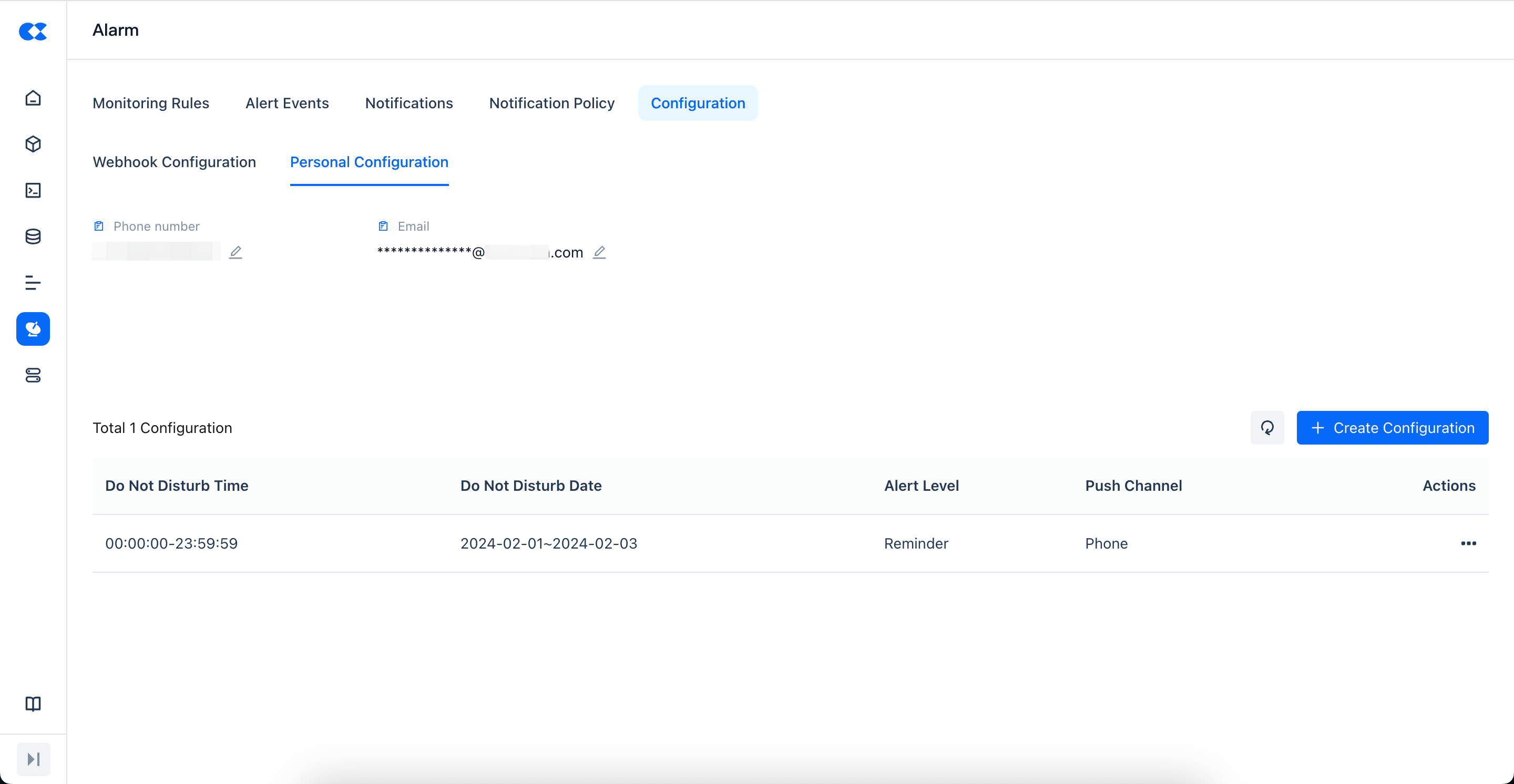 In personal configuration, you can modify the currently logged-in user, the phone number and email address used to receive alerts. In addition, it also supports setting a do-not-disturb period, during which you will not receive system alert messages.