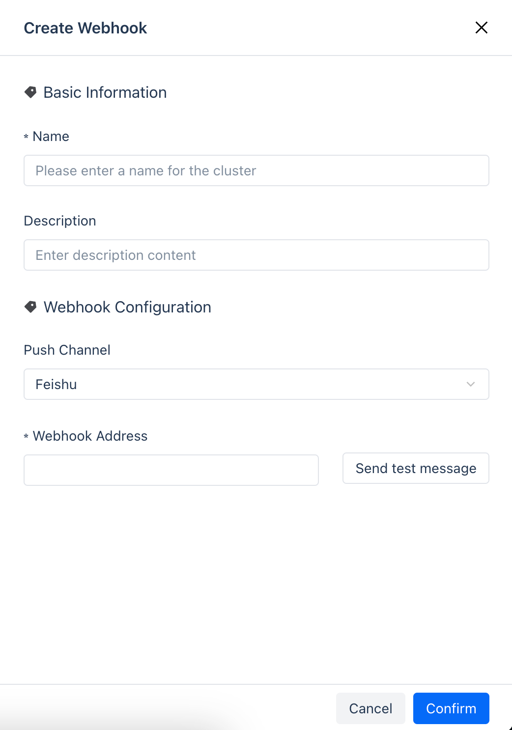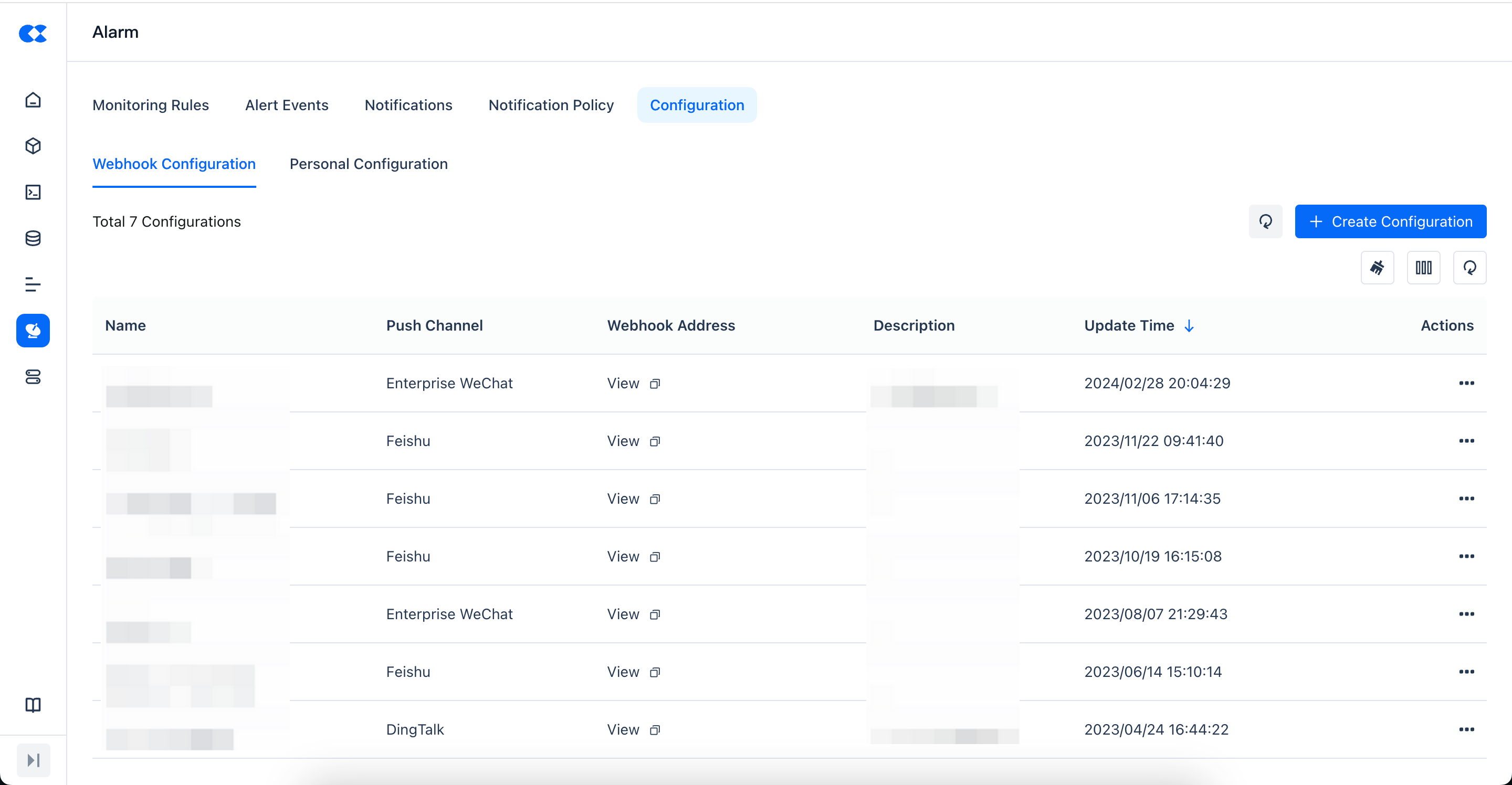 Webhook configuration is used to define the Webhook channels needed for alert push, currently mainly supporting Feishu and DingTalk.