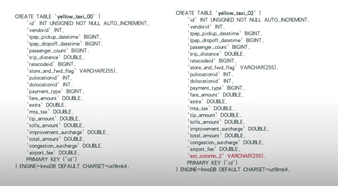 This demonstration takes the common SaaS service model as an example. In a multi-tenant mode, the database adopts a sharding structure, and data exists in different sharded tables. Some tenant information will exist in the same sharded table, and different sharded tables contain custom extension fields for specific tenants. That is, the source end has four basically identical sharded tables, but some tables have slight differences in fields. As shown in the figure below, the yellow_taxi_02 table has an additional extension field ext_columm_2 compared to the yellow_taxi_00 table.