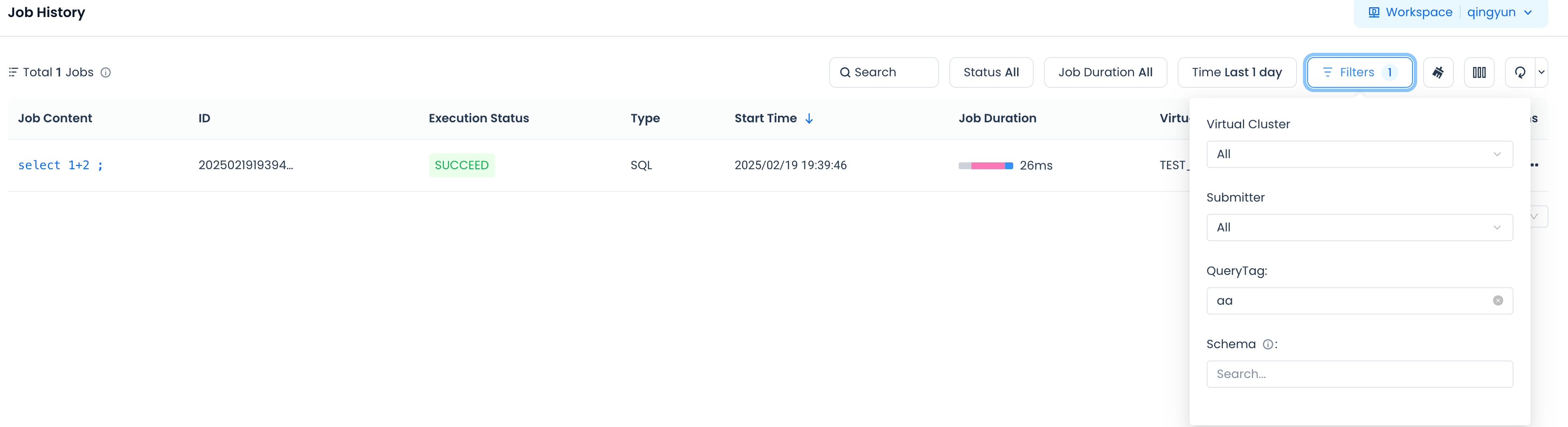 After setting the query_tag, the query job history in the session will automatically add custom tag content in the query_tag field of the job history. It can be set via the set query_tag command or in the jdbc URL. For example:
