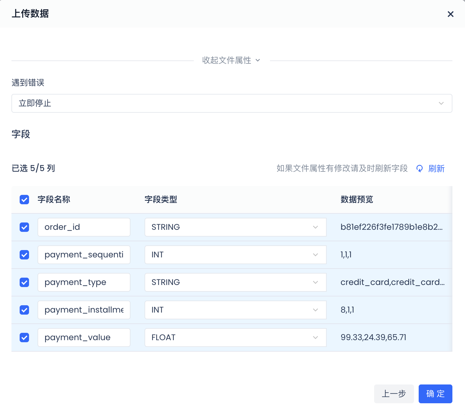 Check and judge whether the automatically parsed field names and field types meet expectations. If confirmed to be correct, click "Confirm" to complete the data upload and create a new table. If there is a problem with field parsing, you can modify the File Properties configuration item to refresh and obtain the automatically parsed field names, field types, etc. Or manually modify the field names or field types. Note: The modified field types may not match the system's parsing, resulting in unsuccessful uploads.