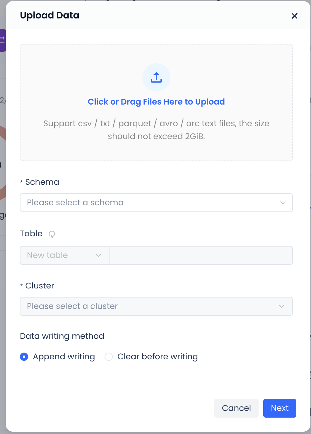 - Suitable for smaller local files (not larger than 2GB) (CSV, TXT, Parquet, AVRO, ORC) to be directly uploaded to a table in Singdata Lakehouse without programming, making it the simplest method.