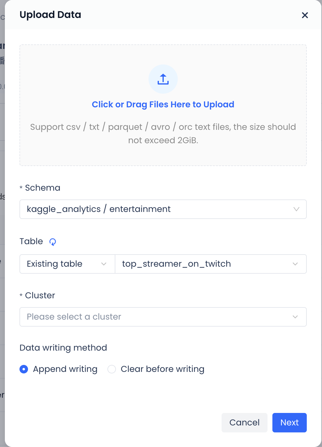 When using the data upload feature, you can create a new table or upload data to an existing table.