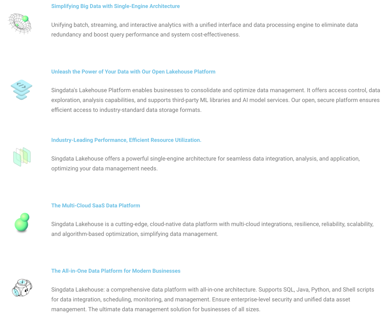 Singdata Lakehouse is a state-of-the-art service that revolutionizes enterprise data management with a comprehensive, managed lakehouse architecture. Our platform is not merely an extension of traditional database technologies or "big data" software platforms; it is built from the ground up with an innovative, cloud-native design that incorporates a brand new SQL query engine. This architecture endows Singdata Lakehouse with all the capabilities of an enterprise datalake/warehouse and a multitude of special features and unique functionalities.