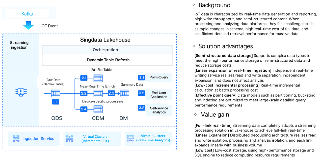 Singdata Lakehouse is suitable for IoT data analysis scenarios, helping enterprises extract valuable information from large amounts of device and sensor data to optimize business decisions.